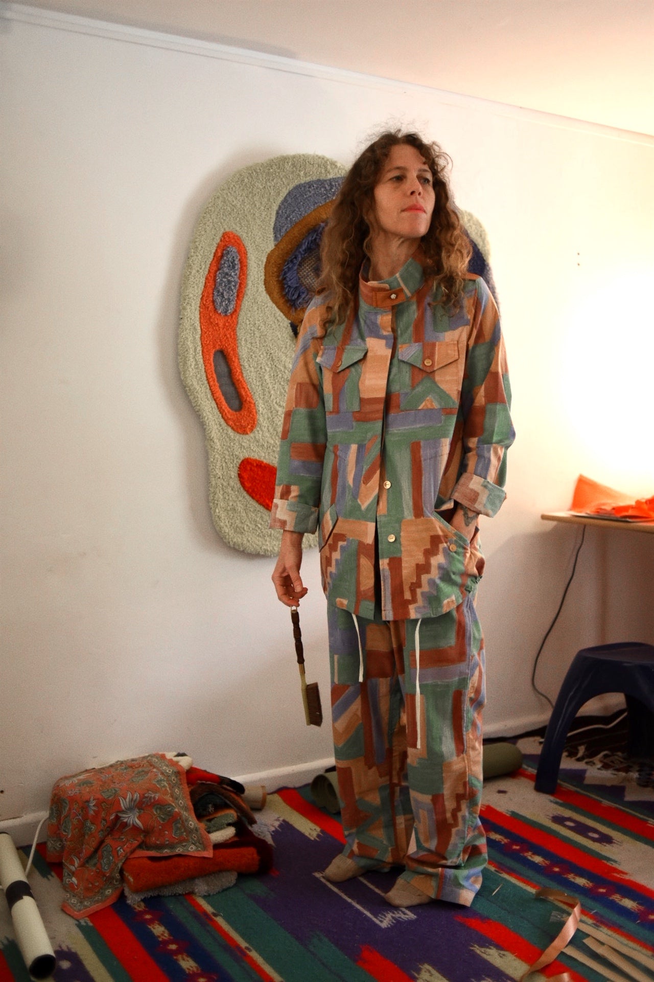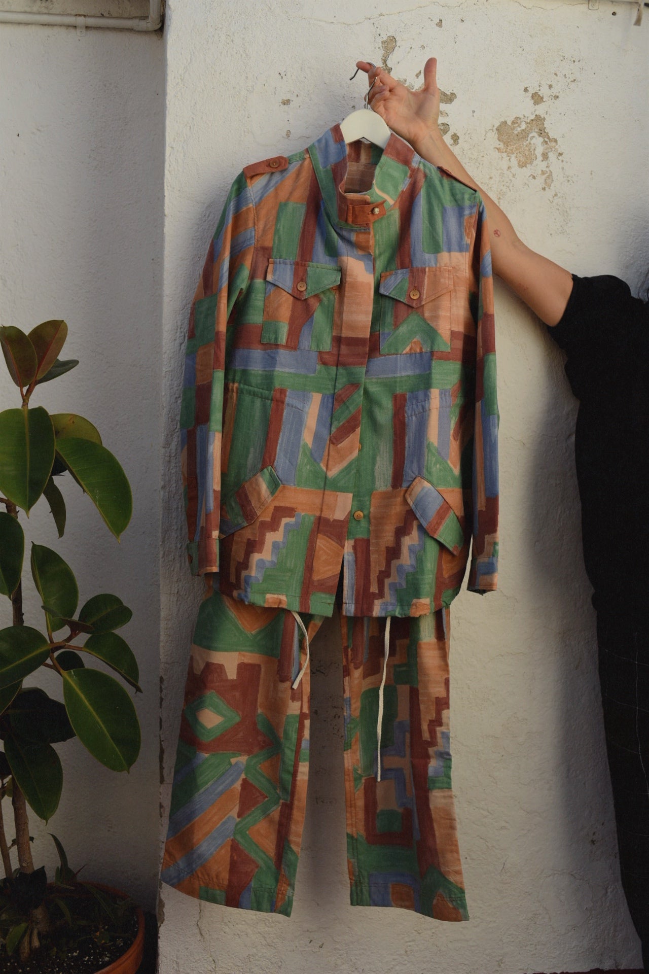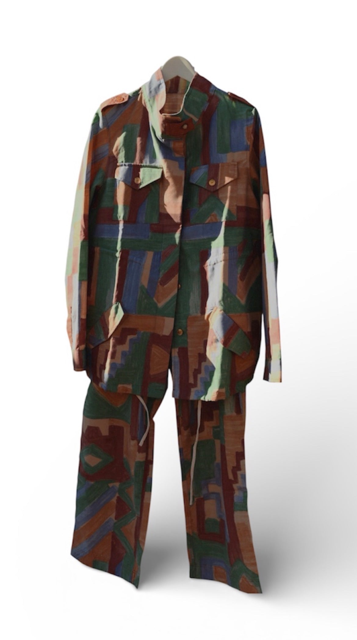 Chaqueta cazadora y pantalón adaptables para varios talles, es over size, totalmente hechos a mano con un tejido único reciclado 100 % algodón, solo existe una pieza.